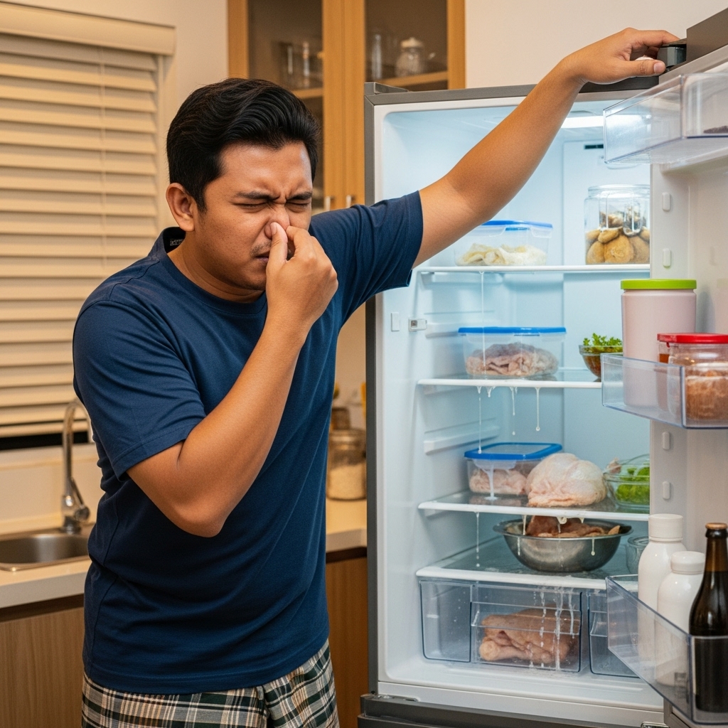 Peti ais kotor & berbau sebab air dari bahan basah menitik ke bawah peti sejuk